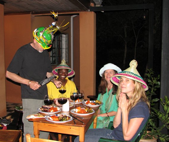 The lamb took a while to cook and the evening grew quite festive as we waited. Eva suggested that we all wear party hats. She and Lucky wore Basotho hats. Joe wore my makarapa, adorned with his head torch. Leslie wore my safari hat and I wore a Baltimore Ravens cap in honor of football Sunday.
