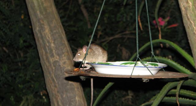 Joe and I had been wondering why the oats and fruit we put in the feeder always disappears at night. Now we know. I think Ratatouille is very cute but Joe doesn’t agree. He went inside and fetched his wooden club, but fortunately Eva scared Ratatouille away before he became the victim of violence.
