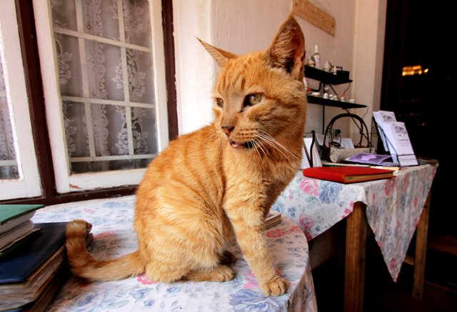 Katharine shows us the dining room and explains the intricacies involved in a formal Victorian dinner. The most interesting tidbit I learned: When a Victorian lady went out to dinner, it was considered inappropriate for her to use the hostess’ chamber pot or to go to the outdoor toilet. So if she had to go to the bathroom, she would say she felt faint and call for her carriage to take her home. Men, on the other hand, were welcome to use the chamber pot or go outside. (Photo courtesy of Joe.)This is not the real dining room; it’s the dining room in Katharine’s doll house. The dollhouse is mind-boggling.The Lindfield House library. The library was the man’s domain. Women were not allowed in unless invited, although men would sometimes ask their wives and daughters to sit with them in the library. Books inappropriate for female eyes were put out of reach on the top shelves.Lindfield House has a small nature room, which Victorian children of the house would have used for studying science. It’s filled with curious objects like exotic shells, skeletons, and pieces of taxidermy. It also includes this human foetus preserved in formaldehyde. Seriously!This stunning walnut bed is the central feature of the main bedroom. Katharine sleeps here.The bed in one of the smaller bedrooms has a pull-out step to make it easier to climb into. The bottom step doubles as a chamber pot. Brilliant.Oscar the Cat.Mom and I love afternoon tea – it’s one of our favorite things to do together on vacation. The Lindfield tea was spectacular – mini sausage and meat pastries, fluffy scones with jam and cream, and some scrumptious cakey-custardy things. The tea itself was also delicious but I unfortunately forgot to ask what kind it was. We did our best to eat everything, but failed. Lucky enjoyed the leftovers. (Photo courtesy of Joe.)