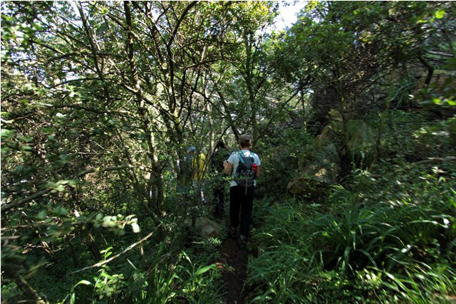 Winded from climbing, we stopped for breakfast on a rocky outcropping in Koppies East. Then we continued back into the central section, walking through a grove of protea trees and into a forested area along a stream.