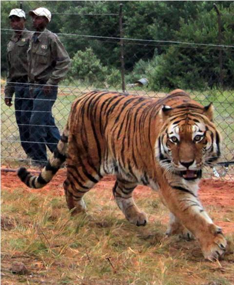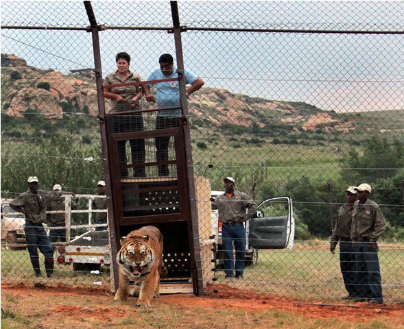 Four Paws invited members of the media to Lionsrock to witness the arrival of Martin, an 8-year-old Bengal tiger, and Bagira, a 15-year-old lioness. Martin and Bagira were rescued from zoos in Bulgaria and traveled more than two days by air and road to reach their new South African home.