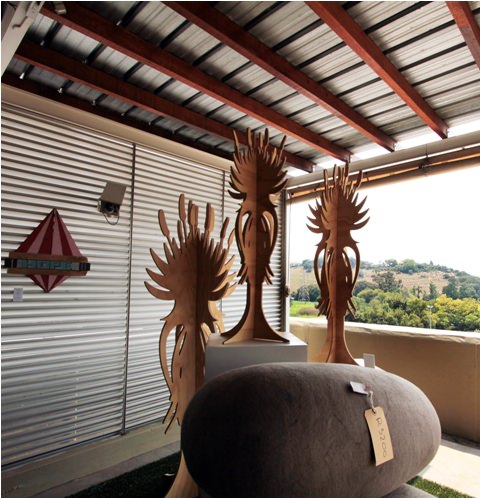 Smoked salmon scambled eggs from Service Station. (Say that three-times fast!)Service Station serves gourmet ice cream, made by a mysterious ice cream lady on the outskirts of town. We had to have some even though it was only 11 a.m. We wanted honey-balsamic-vinegar, but they were all out of that flavor so we got fig with lavender instead.Love Books, next door to Service Station. All the shops at Bamboo flow into one another in this zen kind of way, so you can’t help wandering from one place into another. Without even knowing the name of the shop, my friend said to me, "The owner of this store must really love books."Rings at a jewelry shop called Tinsel. The jewelry is all displayed on cute dollhouse-sized furniture.A fashion and accessory store called Black Coffee. Black Coffee is a super stylish fashion label by designer Jacques Van Der Watts. (Jacques is the first legit Joburg celeb who I’ve been photographed with for my blog – [see the bottom of this post](/2011/02/21/sundays-main-event/ "Sunday’s Main Event").) Black Coffee sells a line of clothing called Love Jozi – the makers of my awesome "No one reads your blog" T-shirt.Upstairs at Bamboo, an art exhibition space on the second floor of Bamboo (obviously). The exhibitions rotate in and out every month or so. This one was a combination of paintings and sculptures by several different local artists.Wooden aloe tree sculptures for sale at Entropy, a store that sells all kinds of fun, artsy stuff. Nice view of the [Melville Koppies](/2011/02/03/melvilles-grassy-summer-wonderland/ "Melville’s Grassy Summer Wonderland"), where real aloe trees are growing, in the background.