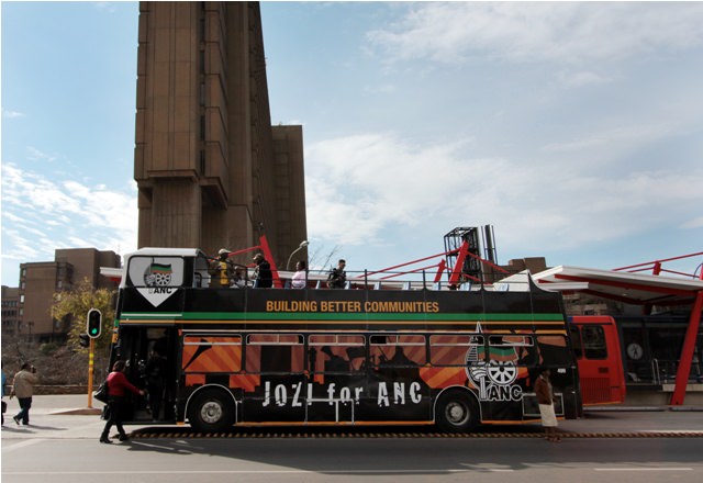 There were three buses lined up – two Joburg rapid transit buses, and a double-decker tour bus plastered with ANC propaganda. I headed straight to the top of the ANC propaganda machine. There’s no better way to see a city than from the top of a double-decker bus. And I happened to sit behind the two most interesting people on the tour.
