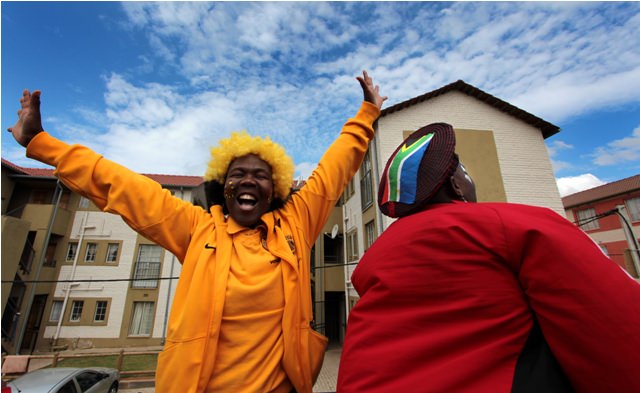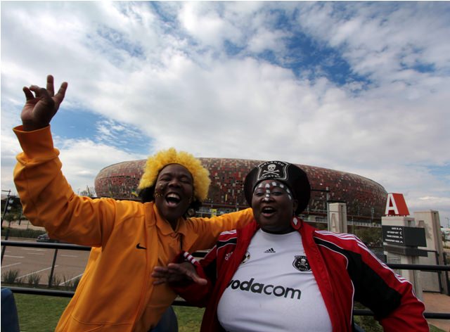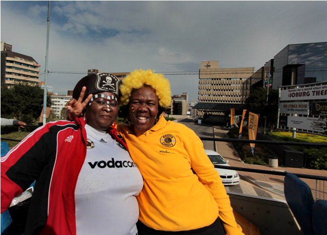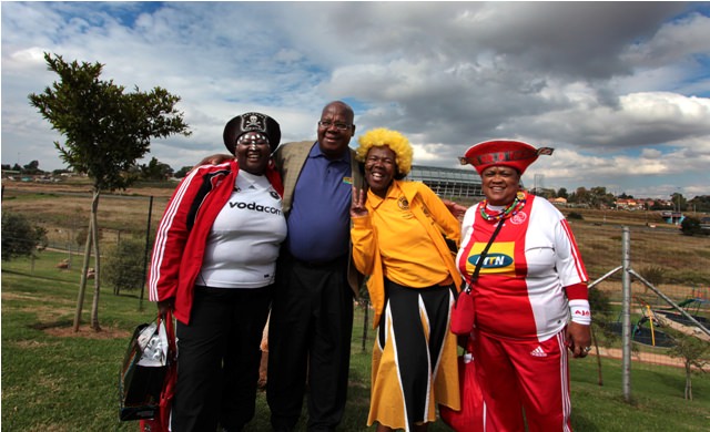 Our convoy took off, along with half a dozen metro police cars with sirens blaring. No stopping at red lights. (It pays to travel with the mayor.) ANC rally songs pumped from a loudspeaker at the front of the bus. The Football Divas sang, danced, and waved to their fans.