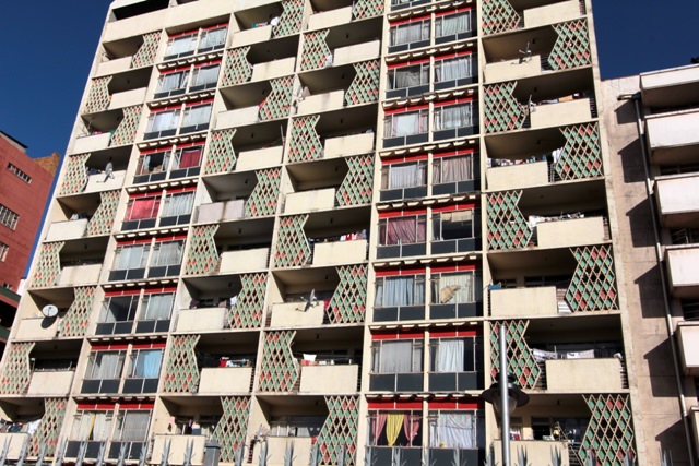 Walk down the street in Hillbrow and you’re simultaneously assaulted with Africa’s past, present, and future. Look up at the vividly colored mid-20th-century high-rises – a select few nicely restored, most crumbling and draped with laundry lines. Look down at the sidewalks, strewn with trash and random junk, interrupted by the roots of stately old trees. Look around at the masses of people – Hillbrow streets are always brimming with people of all ages, from all over Africa. There are countless Hillbrow stories begging to be told.