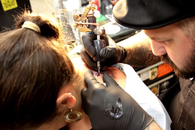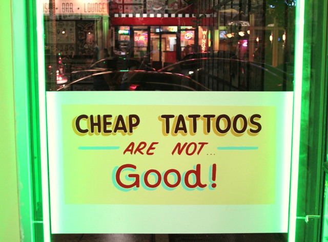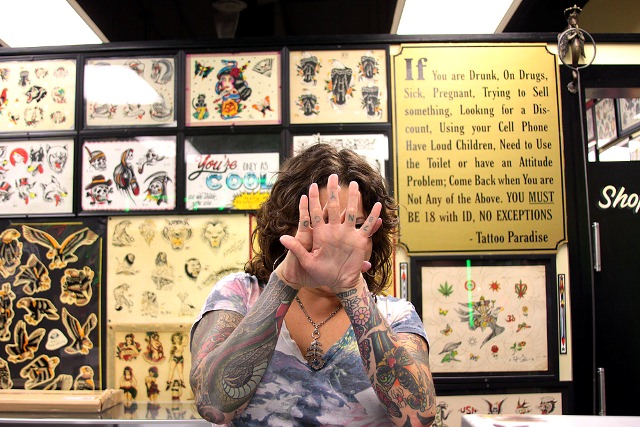 But the tattoo parlor is right across the street from Madam’s Organ. Our transition between the two establishments feels almost seamless, especially after my dose of liquid courage. Before I know it we’re in Tattoo Paradise, studying rows of sample tattoos coating the walls.