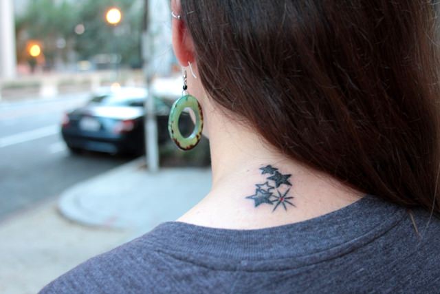 Claire is getting a bird on her hip. I want a tattoo that represents my life in Africa, so I’m getting five stars on the back of my neck. The stars are for my house in Melville, which Joe and I call the Lucky 5 Star. I love that house – it’s so perfectly quirky and South African. What better way to honor it than with a tattoo.