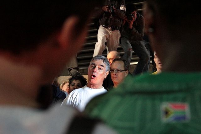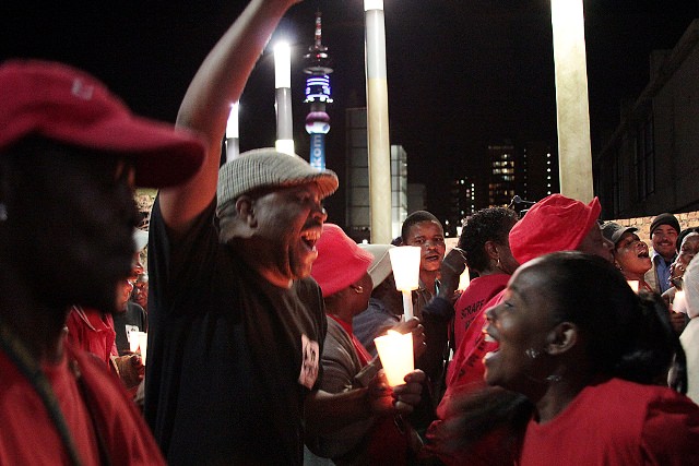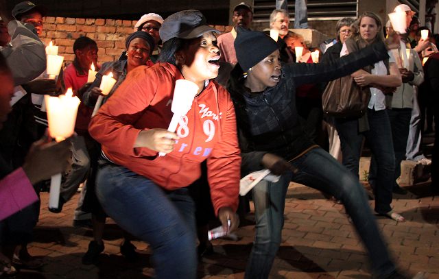 A South African recently told me, “We sing and dance when we’re happy, and we sing and dance when we’re angry.” Last night was a perfect illustration of that. After everyone who wanted to speak had spoken, the crowd burst into song and dance, singing ‘struggle songs’, the very same songs that were sung during the anti-apartheid era, and ’toyi-toying’, a kind of protest dance that involves foot-stomping and twirling around.