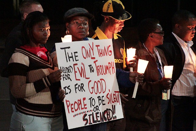 Obviously I wasn’t in South Africa during the anti-apartheid struggles of the 1970s and 80s. The vigil gave me a tiny taste of what it might have felt like. I hope this doesn’t sound idealistic or overly dramatic. But last night reminded me that the world is a scary place. Repressive governments around the world are cracking down on their people. Those repressive governments are sparking mass resistance, leading to bloodshed and death. South Africa, although it’s considered one of the most stable (and certainly the wealthiest) countries in Africa, is not immune from that kind of instability.
