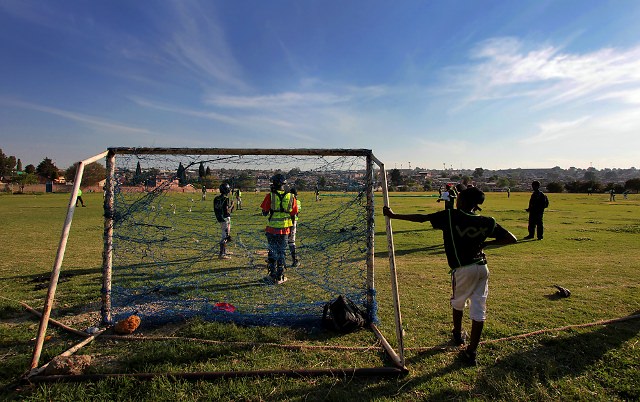 The first thing I noticed were the fields. The kids play on grass fields with no baseball diamonds on them. The backstops are old soccer goals with fraying nets. The foul lines are ropes that refuse to stay straight. But thanks to Sine and other supporters of Alexandra Baseball, there are enough gloves, bats, and baseballs to go around. Almost all the kids have uniforms, although all the teams have the same T-shirts, sponsored by a local cell phone company. The players wear black and green jerseys over their shirts so they can tell each other apart.