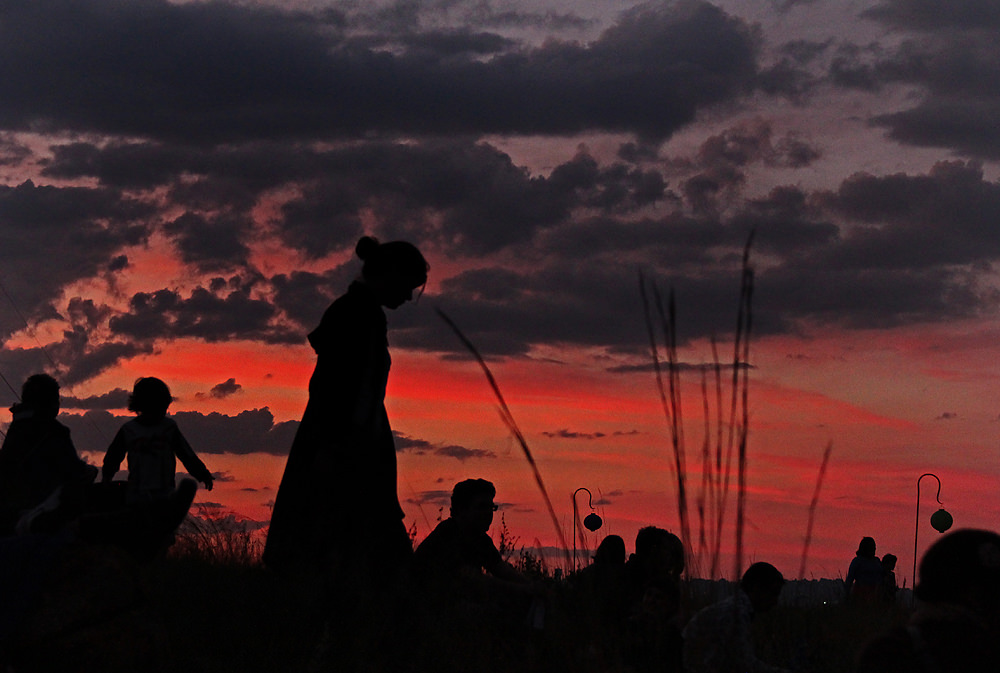 Spectators settle in as the sun sets.