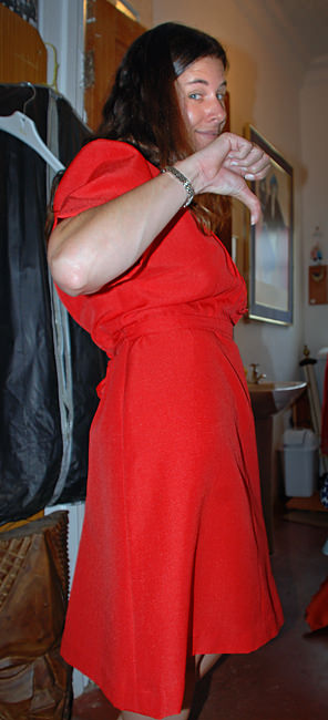 Sounds like my kind of place. I LOVE thrift shopping! And I TOTALLY love the orange dress–to die for! Thanks to Smokey for that photo. Hugs, Kathy