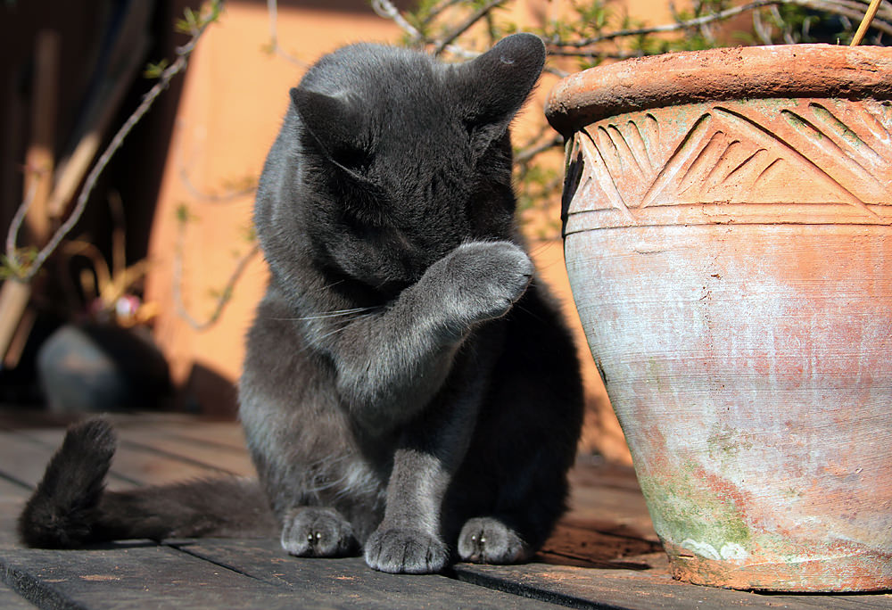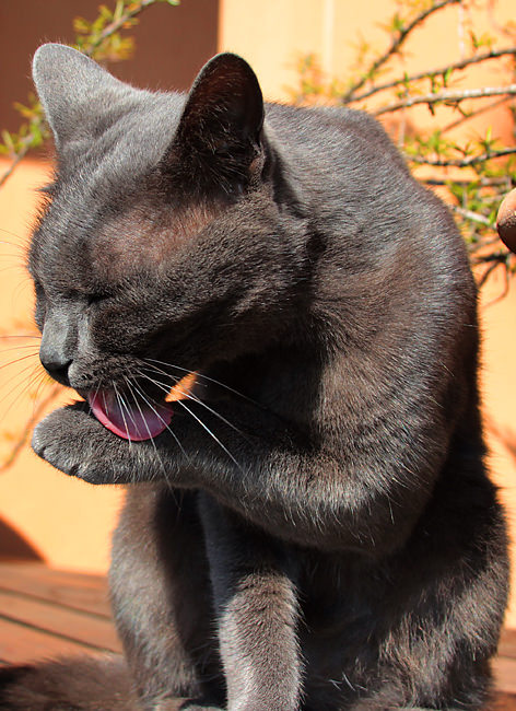 After breakfast, I bathe again. I am a very fastidious cat. I clean myself for several hours each day.