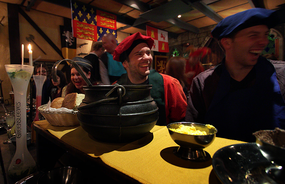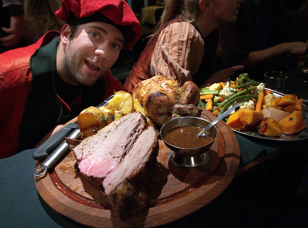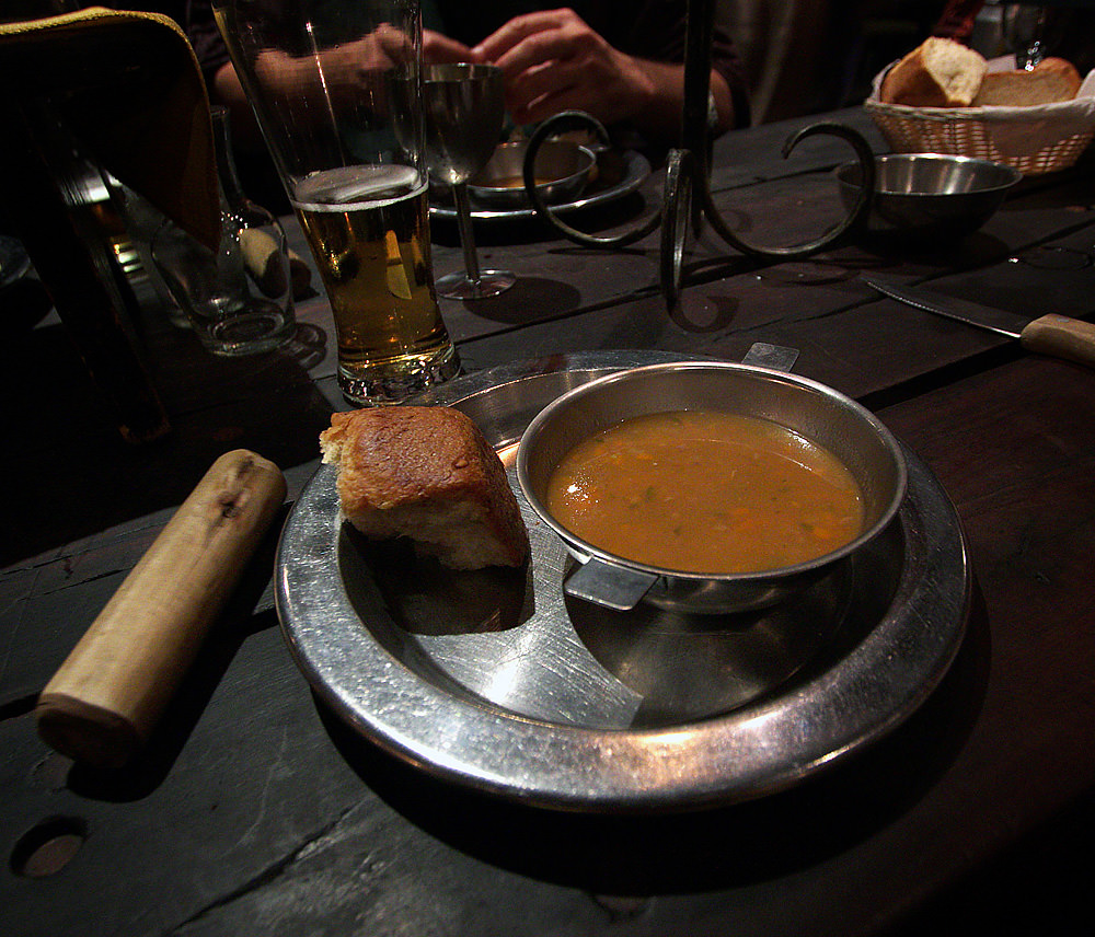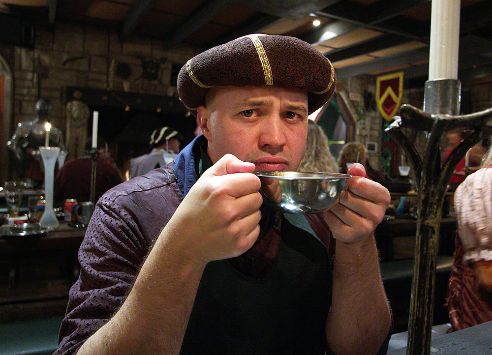 Laughing at the Baron over a steaming iron pot of soup. Note that the Greensleeves signature drink (at left) is something called “Ye Half Yard”. Not very medieval-looking. I was also disappointed that beer was served in regular glasses rather than medieval-style steins.