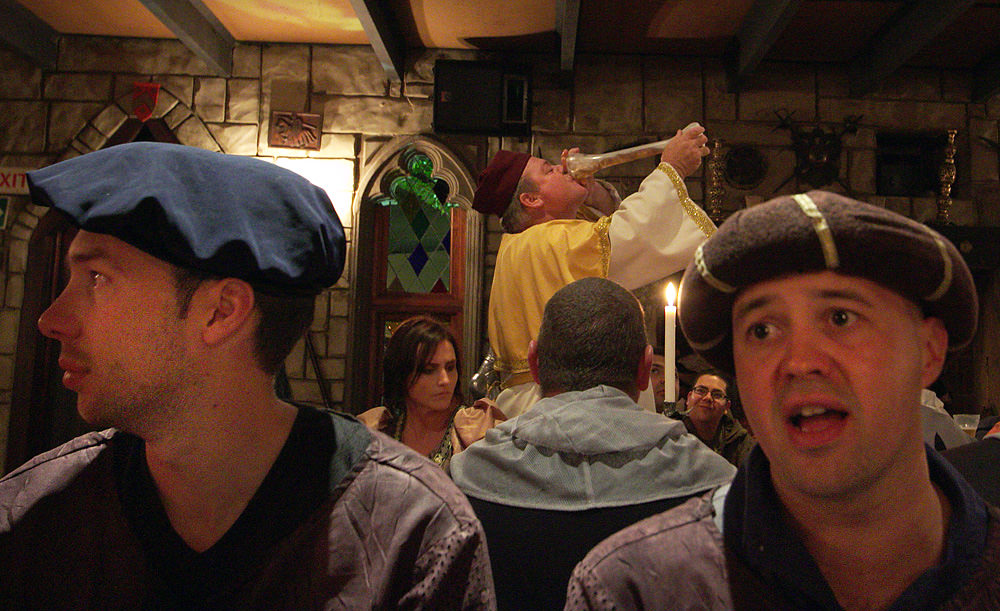 The Baron informed us of several rules. First, there was to be no clapping. We were to display our approval by banging our wooden mallets upon the table. Second, the Baron reminded us that we had traveled back to an era before women’s liberation, when ladies existed solely to please their lords. If a lord at the table required salt for his food (a necessity because the food was on the bland side), a lady at the table must get up and go to the table of the Archbishop, curtsy, and say, “Please sire, I require salt for my squire.” The Archbishop would then bequeath thee a pinch of salt. I think I was the only lady at my table who actually did this.