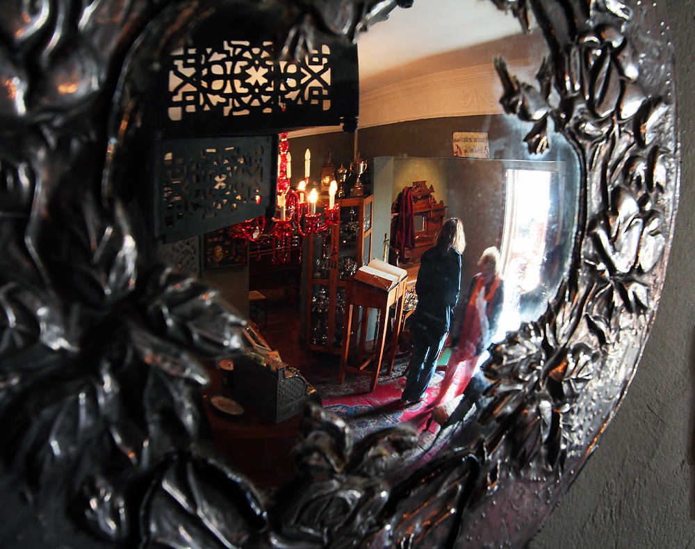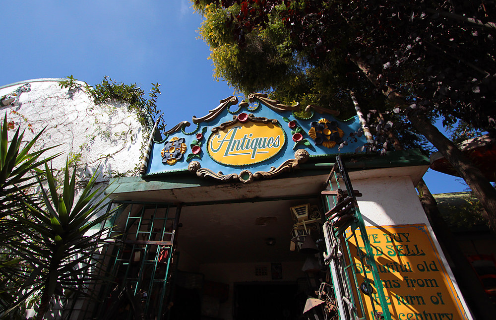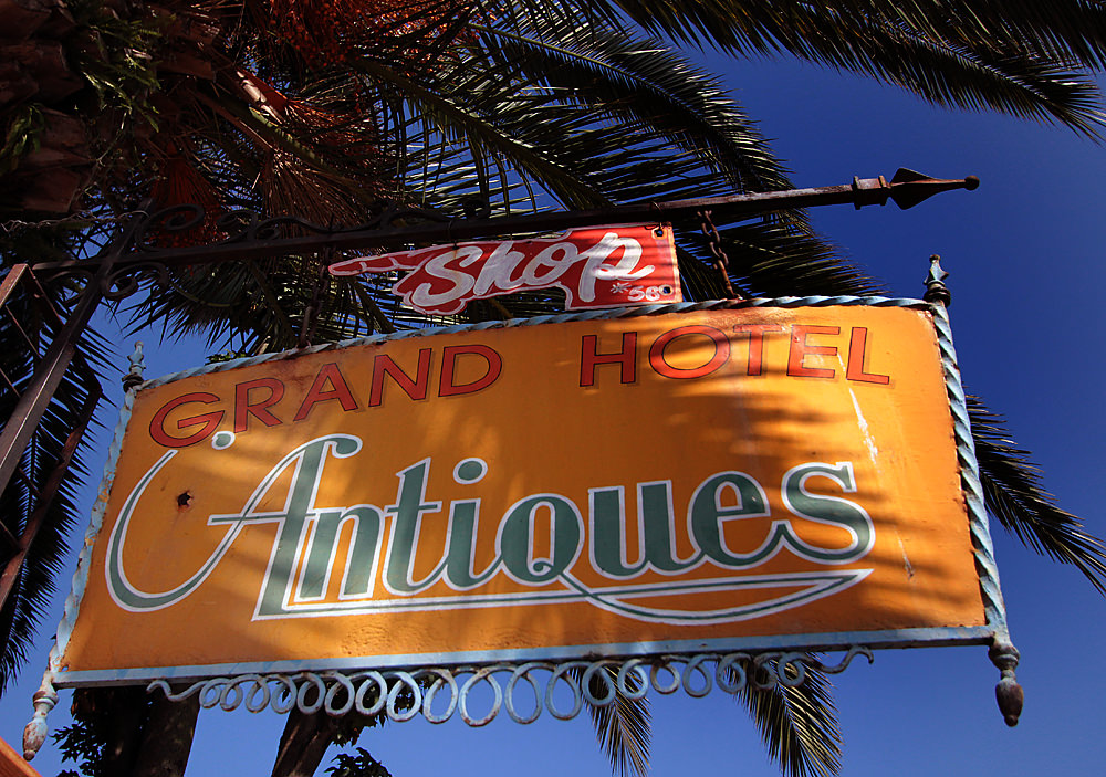 A quirky antique sign outside a quirky antique shop. Note the bullet hole.