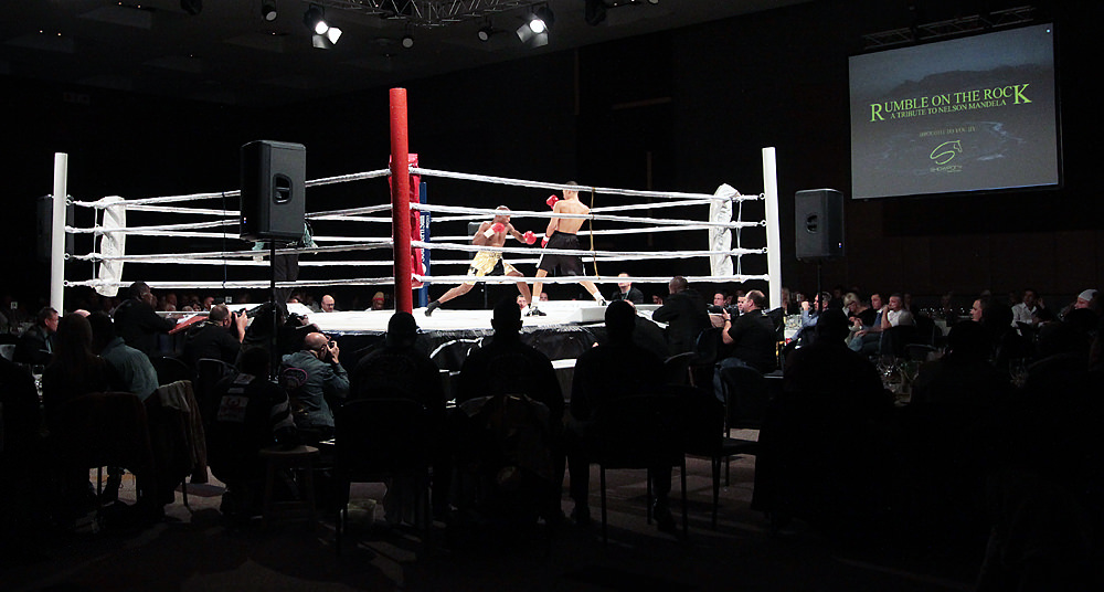 The ring was set up in the center of a ballroom, surrounded by well-heeled spectators who ate a fancy dinner while watching the fights. I – along with the rest of the Hillbrow Boxing Club crew – hung out at the back in the standing-room only section. The event was named “Rumble on the Rock: A Tribute to Nelson Mandela”. We weren’t on a rock though, and Madiba was nowhere to be found.