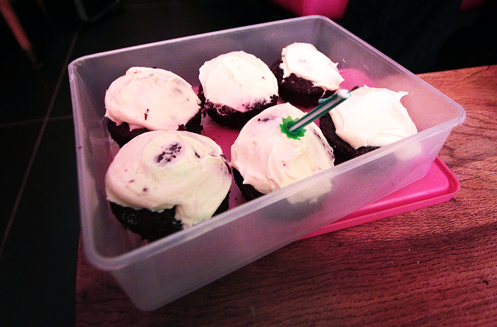 Chocolate cream-cheese cupcakes from Anita and Johnson. The photo isn’t great and the cupcakes weren’t the prettiest. And yet, so yummy. All 18 of them were gone before I went to bed last night. I ate at least eight or ten of them myself.