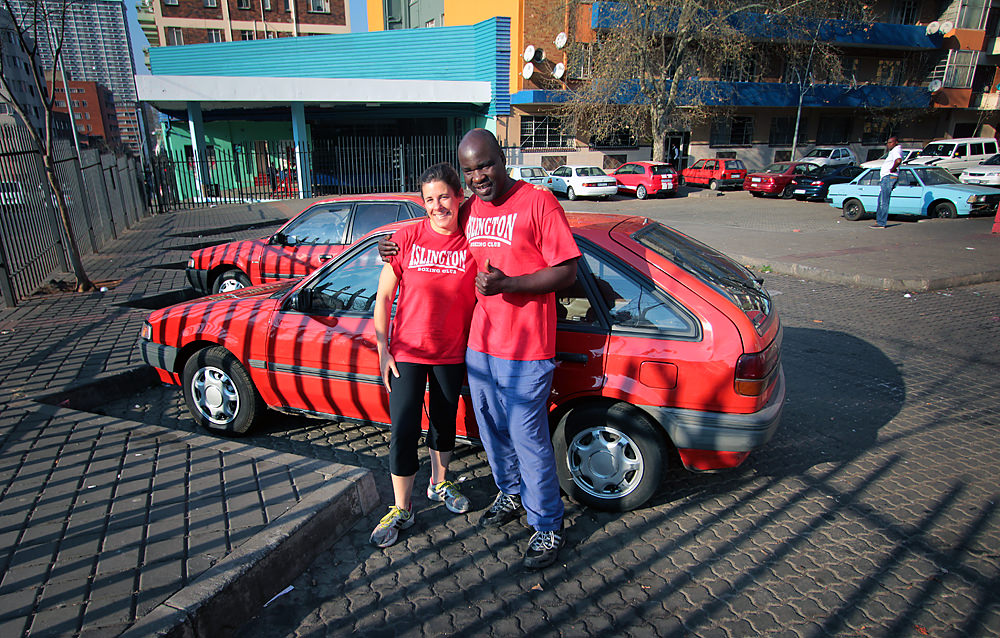 George, my boxing coach, helps me celebrate Flash’s arrival in Hillbrow this morning. (Photo: Anita Powell)