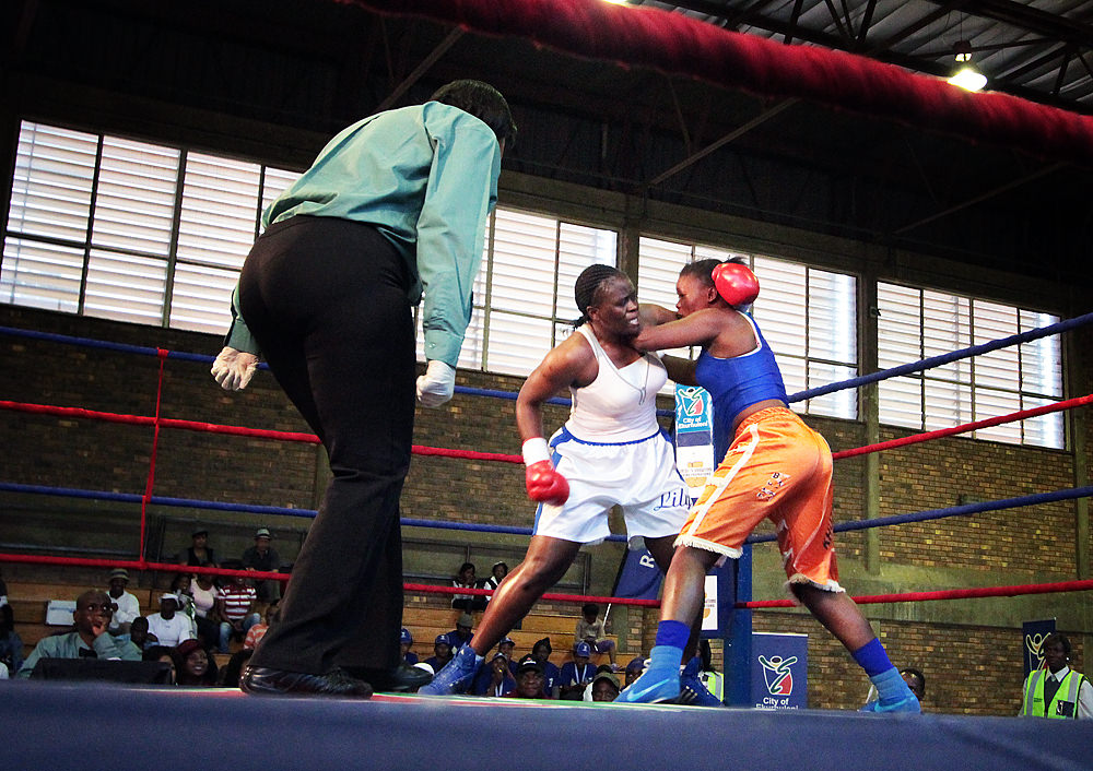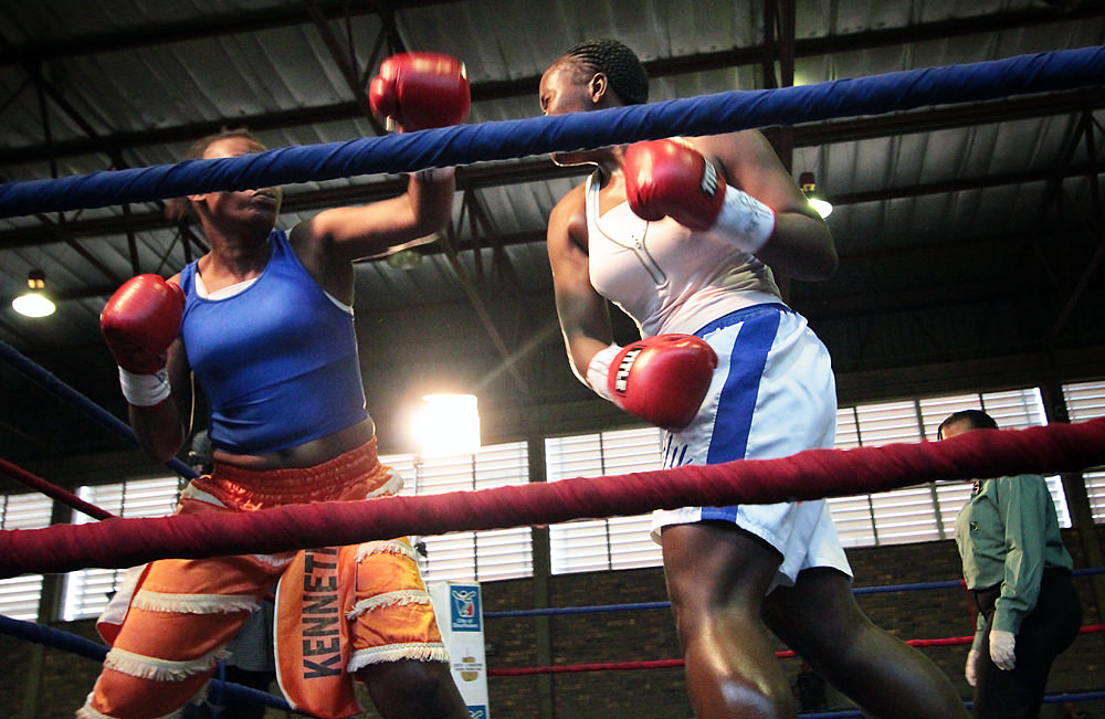 Lily prepares to deliver an uppercut to her opponent, Thato Mohlala.