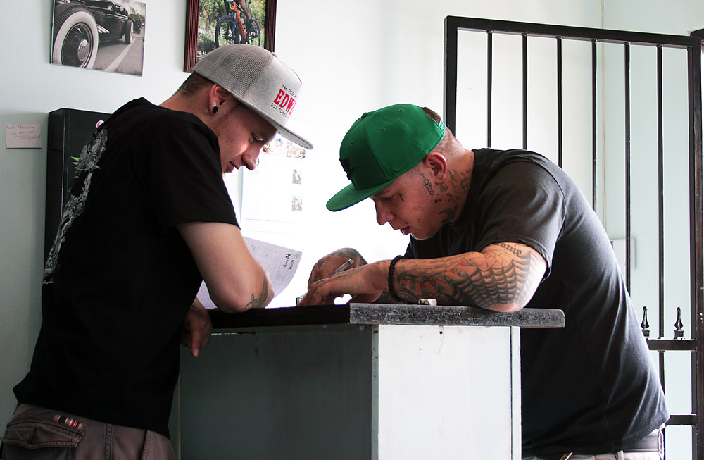 Upon arrival, Ruth conferred with Renato and Maks, her tattoo artist. She showed them a picture of what she had in mind. Maks started drawing.