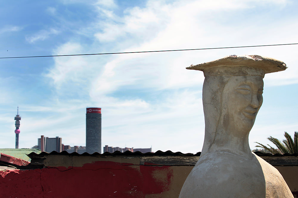 In the background, the two towers. In the foreground, a larger-than-life cement statue by Troyeville artist Winston Luthuli.