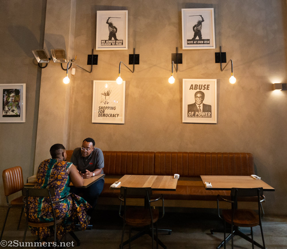 I call Artivist an “art bar”, but it’s really a restaurant/bar/art gallery/music venue. I went early on a Thursday evening and found a nice smattering of guests, a friendly and talented bartender, tasty African snacks, and a thought-provoking exhibition by Zimbabwean artist Kudzani Chiurai.