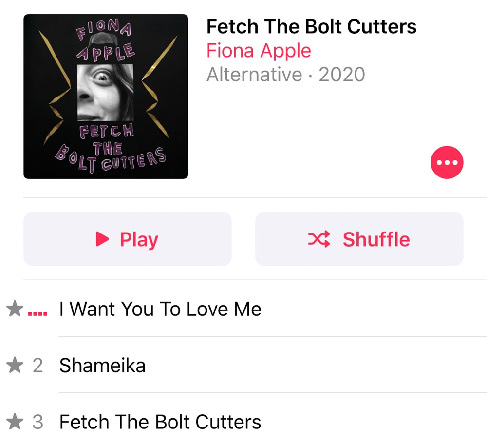 Scrolling mindlessly through social media, I suddenly remember that last night I downloaded Fiona Apple’s new album, Fetch the Bolt Cutters. I’d been listening to a review of the album on a New York Times podcast, just before drifting off to sleep, and after hearing one brief clip I knew I needed this music in my life.