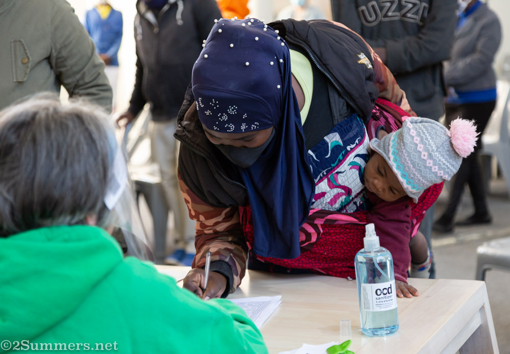 All of the compliments I gave to the volunteers above also apply to the people who came to pick up their parcels. Every single person at the church today was respectful and kind. Everyone wore a mask (when they weren’t drinking coffee). Everyone socially distanced. Everyone sanitized. Everyone was patient and helpful.