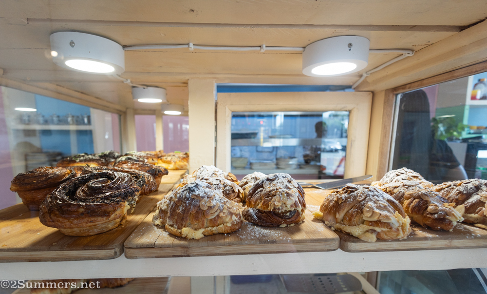 I haven’t told you much about De Baba’s food yet. Currently the restaurant serves breakfast, lunch, and a fabulous array of pastries, cakes, and breads. Everything I’ve eaten there (and I’ve eaten quite a lot) has been amazing, but highest marks go to the almond croissants, the blondies – which are huge and moist and stuffed with nuts and chocolate – and the sunflower sourdough bread.