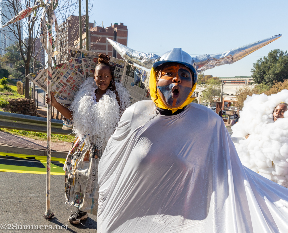 This wasn’t a conventional parade, where spectators line up along the street and stand in one place as floats and performers pass by. In this case the spectators were the parade; the performers were mixed in with the spectators and also popped up at various stops along the way. Those of you who attended the Brixton Light Festival, which was masterminded by the same brilliant people who planned Hey Hillbrow!, know what I’m talking about.