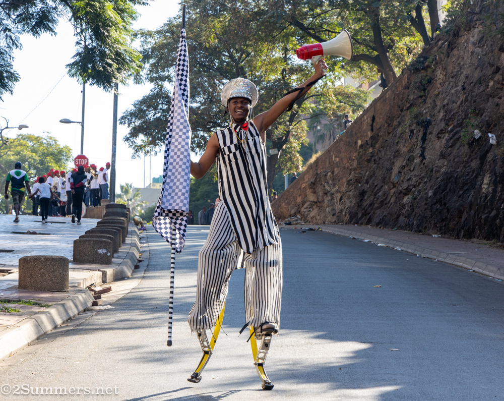 A girl waves a flag during the "Hey Hillbrow! Let’s Dlala!" parade last Saturday. "Dlala" means "play" in isiXhosa.One of the leaders of Hey Hillbrow! climbing the iconic Nugget Hill (on stilts).